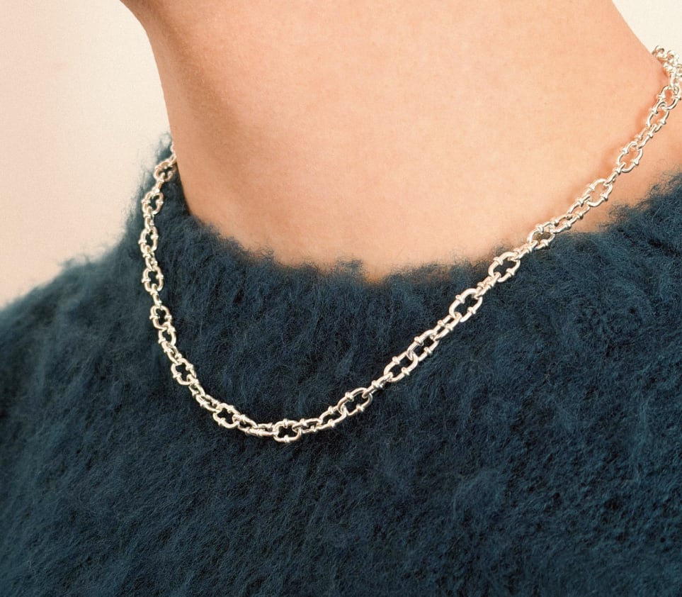 nauté Signature Necklace “Erea Knot Petite” ブランドを象徴する“Erea Knot”を小ぶりに仕立てたシグネチャーデザインのErea Knot の"Petite"(プティ)サイズのネックレス。 時の粒がそっと指先から流れ、結び目がその刻みを小さく重ねていく。 Erea Knotが紡ぐ記憶のつながりをプティサイズではより繊細に表現しました。