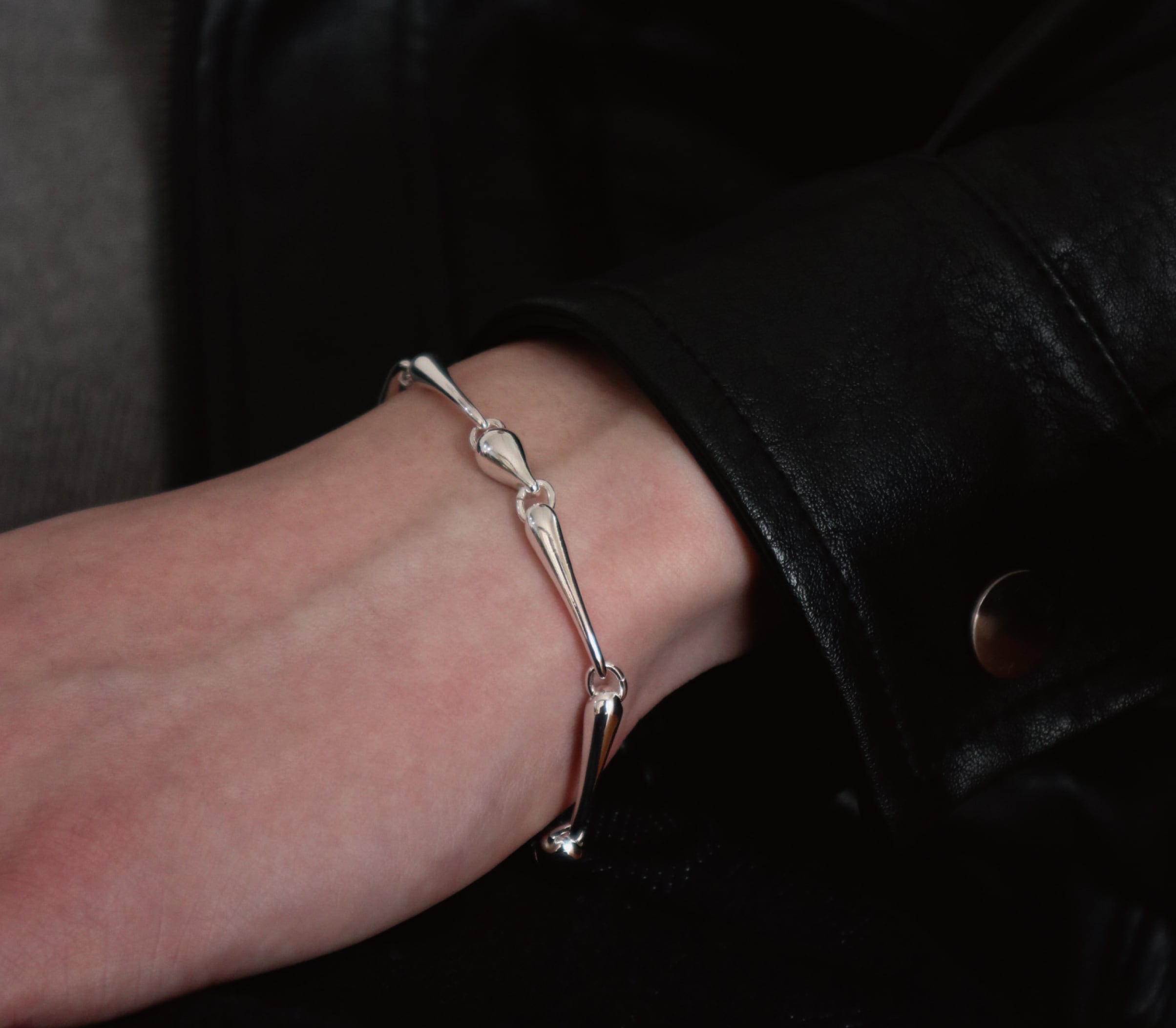 H Drop Bracelet “Veiné” 大地を巡る脈をテーマに実際に自然にある石からデザインインスピレーションを受けたされたブレスレット”Veiné”(ヴェーヌ) 連なるドロップ状のパーツは川の軌跡のように緩やかにカーブを描き、装いにさりげない立体感と上品な存在感を添えます。 コーディネートの仕上げとして、日常を静かに引き立てる一本です。